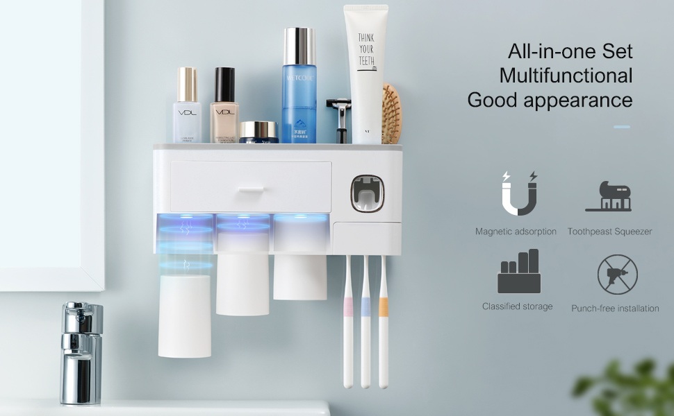 ✅Multi-Storage Compartments – Top shelf holds toothpaste, skincare products, razors, or other essentials in one place This multi-function toothbrush holder comes with a automatic toothpaste dispenser, making it easy to squeeze the toothpaste without waste. Space-Saving Wall Mount – Strong adhesive design saves counter space while keeping items within reach Not only a toothbrush holder and toothpaste dispenser, but also a storage tray. Not only can store combs, toothbrushes, toothpaste, soap, razors, etc., You can also put commonly used cosmetics and bathroom accessories to make your bathroom more tidy